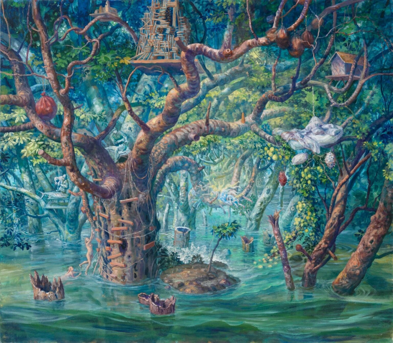 Grand in scale and scope, the intricate paintings bear titles like “Self Portrait as Emergency Shipwright” and “Self Portrait with Sanctuary,” which nod to the personal details within each work. Various characters recur in the pieces, but where they once appeared alongside fresh fruit as an enduring metaphor for youthfulness, today, they’re surrounded by imagery of decay.”I find myself repeatedly drawn to landscape painting in order to explore my own issues, both planetary and personal,” she says. “I imagine landscapes that bear witness to our rise and fall as a great power but also to the workings of one woman’s mind.”