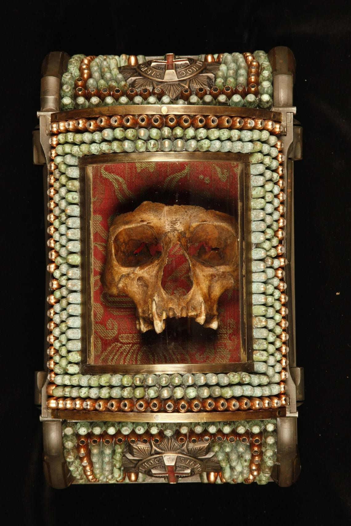 “Casket Reliquary Skull Fragment of Santo Guerro” by Al Farrow is on display at VISU Contemporary in South Beach. The work includes a real human skull encased in a reliquary decorated by bullets. Courtesy of VISU Contemporary