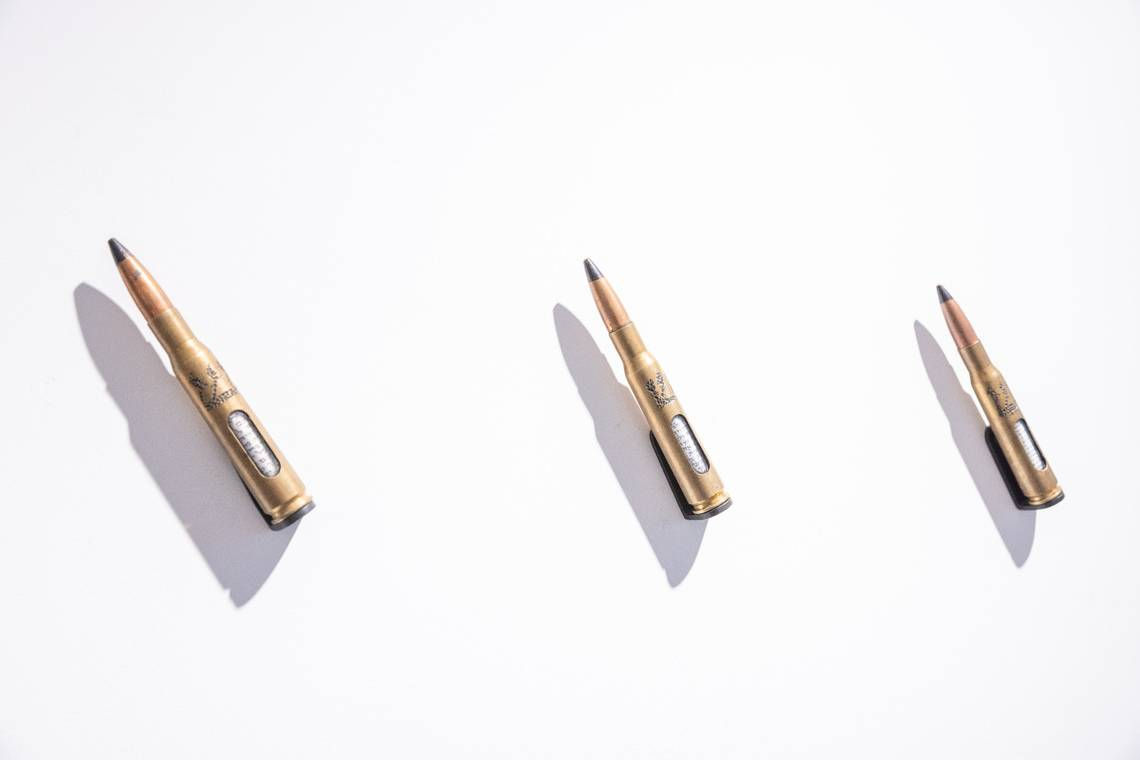 Artist Al Farrow retrofitted old shell casings into mezuzahs, which are doorposts often found in Jewish homes. The sculptures are on display at VISU Contemporary on South Beach. Shot by Shaun Photography