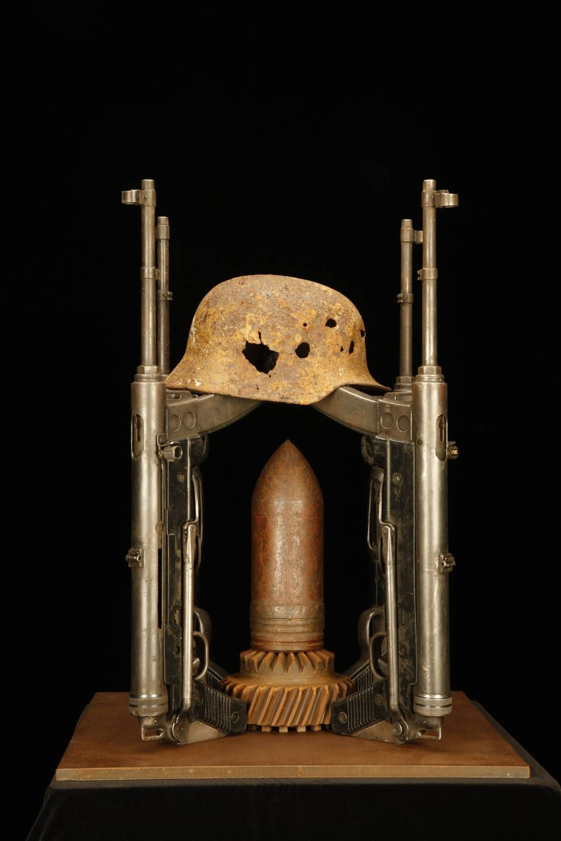 Some of Farrow’s art supplies have seen the horrors of war. A rusted helmet with gaping holes is perched on top of one artwork — a grim reminder of the fate of the soldier who wore it into battle. Farrow pointed at a sculpture meant to resemble a burnt church. It was made with three real rifles from the Battle of Verdun, the longest battle in World War I.