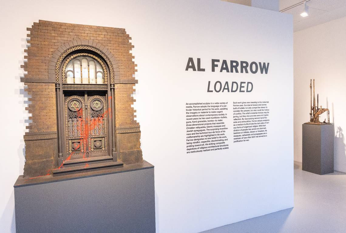 A gash of red paint is splattered across the door of an otherwise beautiful synagogue. The decorative glass arch above it is pocked by gunshots. Based on the Nazi rampage of Kristallnacht, Halpyrn said, the grand synagogue door made of steel, gun barrels, cartridge shells and bullets is from Farrow’s series of vandalized houses of worship.